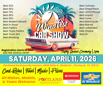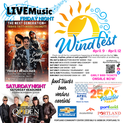 The Portland Chamber of Commerce hosts the annual Windfest Festival on April 9-12, 2026, at the Portland Community Center. Windfest is a family-friendly event that features a carnival, activities for all ages, and live entertainment. For more information on the activity schedule, entertainment and tickets, please visit us online at www.windfest.org for tickets.