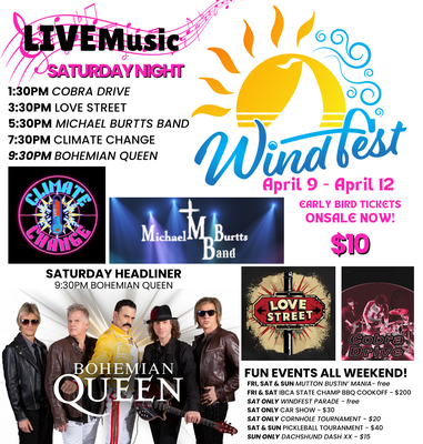Our Annual event brings in over 10k attendees and there are lots of fun things to be a part of this year! Activities include Windfest Parade, Live Entertainment, Dachshund Dash, Car Show, Marketplace vendors, IBCA Sanctioned State Championship BBQ Cook-off, Cornhole Tournament, Pickleball Tournament, 3-on-3 Basketball Tournament, Carnival and returning for a second year include Mutton Bustin’ Mania, Kite Flying Expo, and Run Like the Wind 5K.