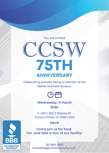 Corpus Christi Stamp Works is having a Better Business Bureau Anniversary recognition (75 years of being a BBB member).